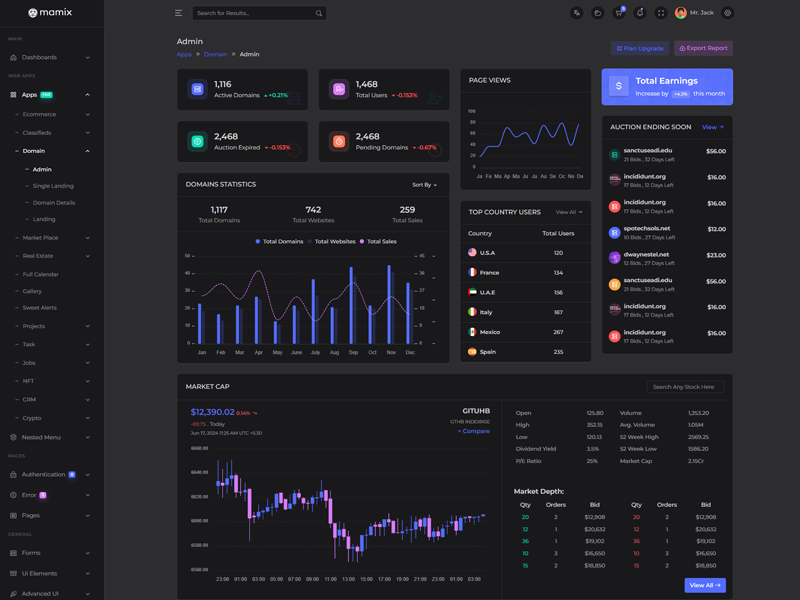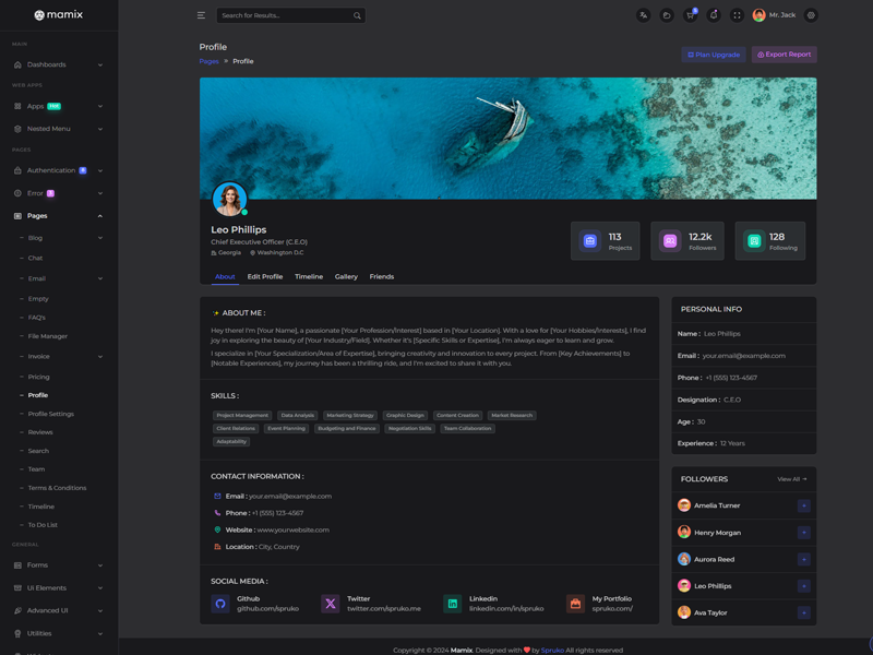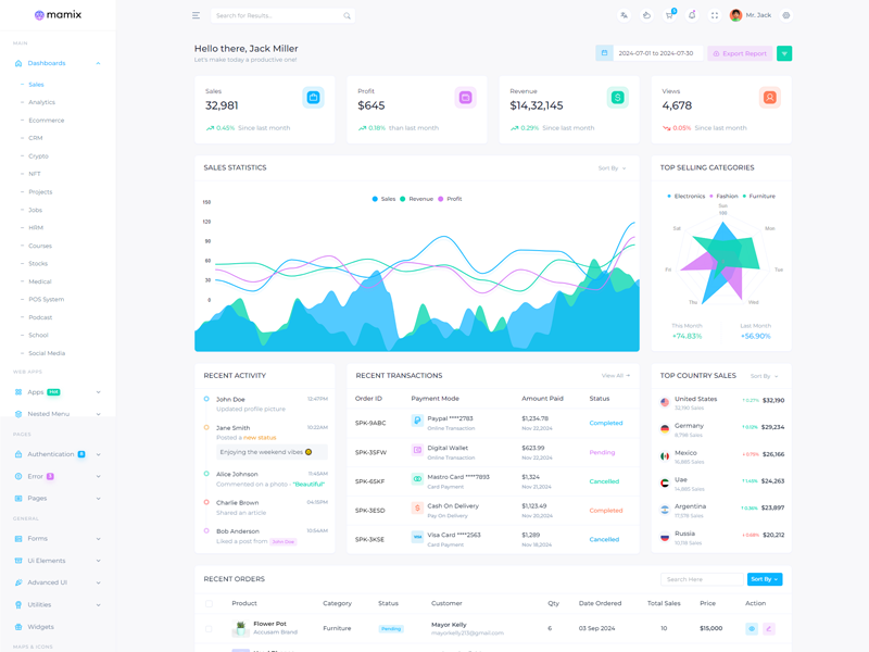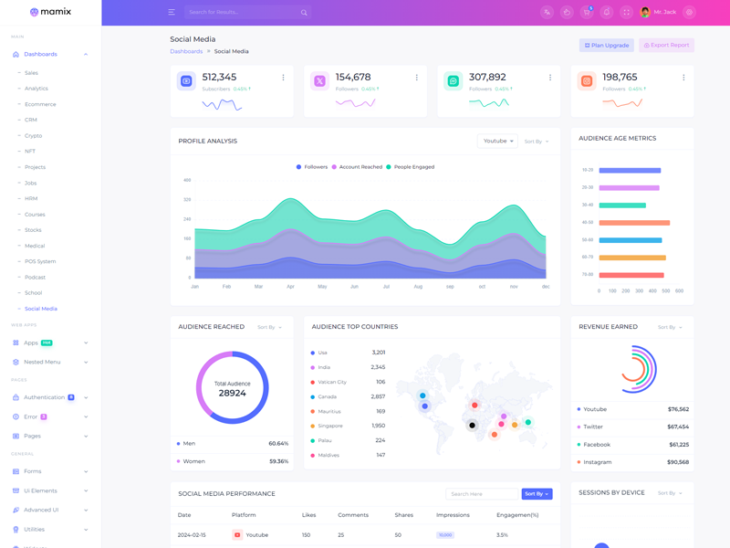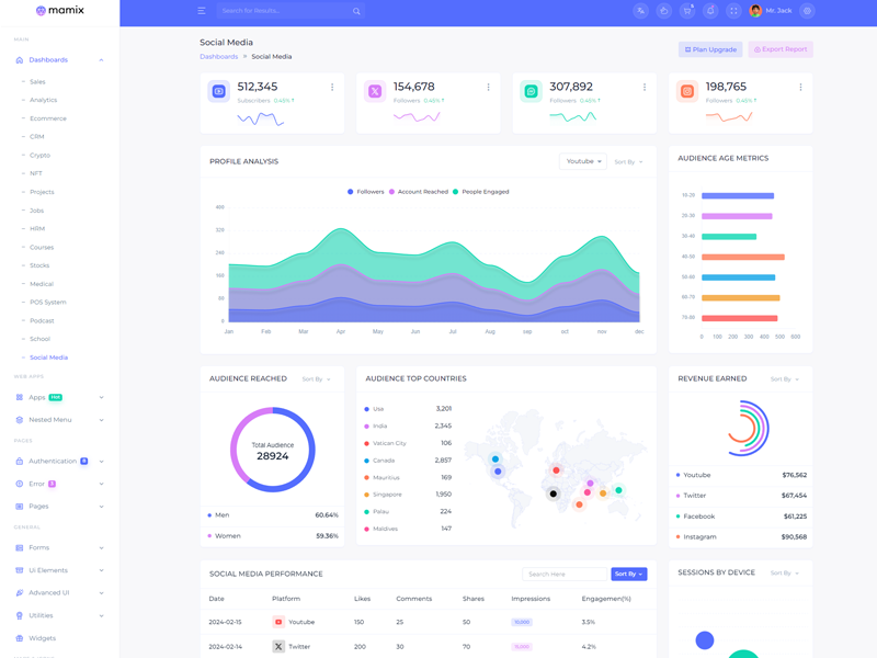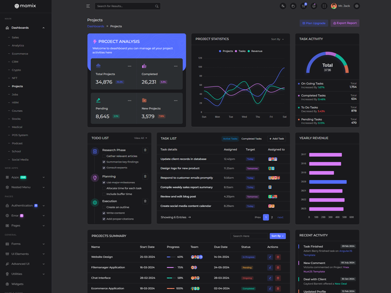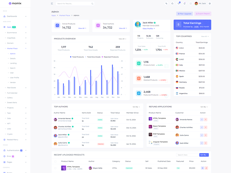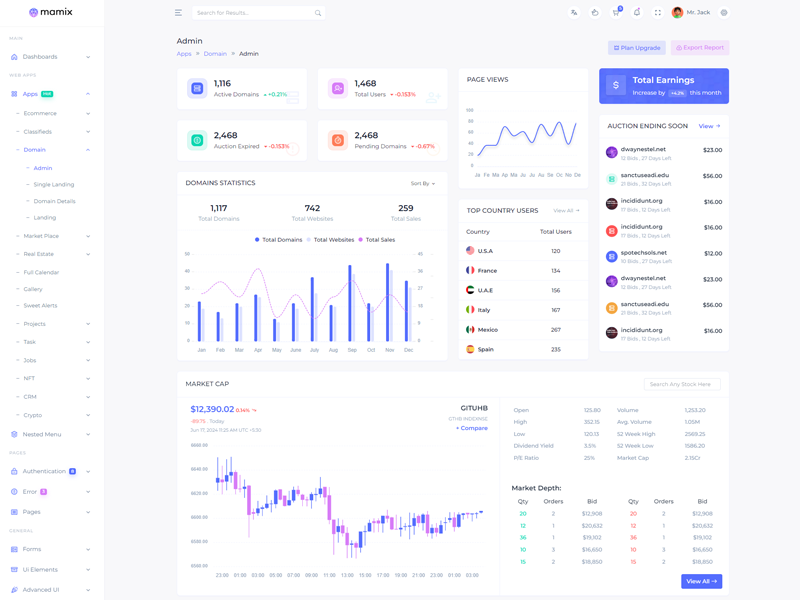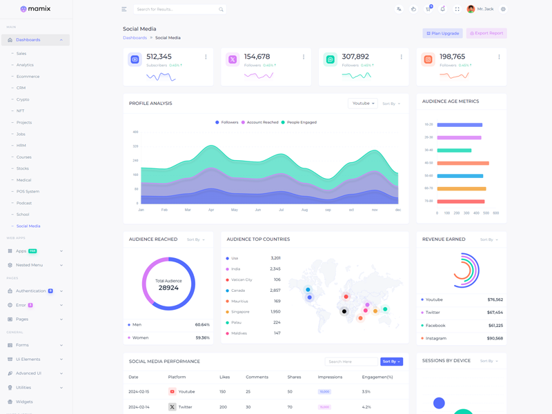 The Mamix Admin Dashboard template is flexible and fully customizable. To use your own content, you can easily customize the source files.