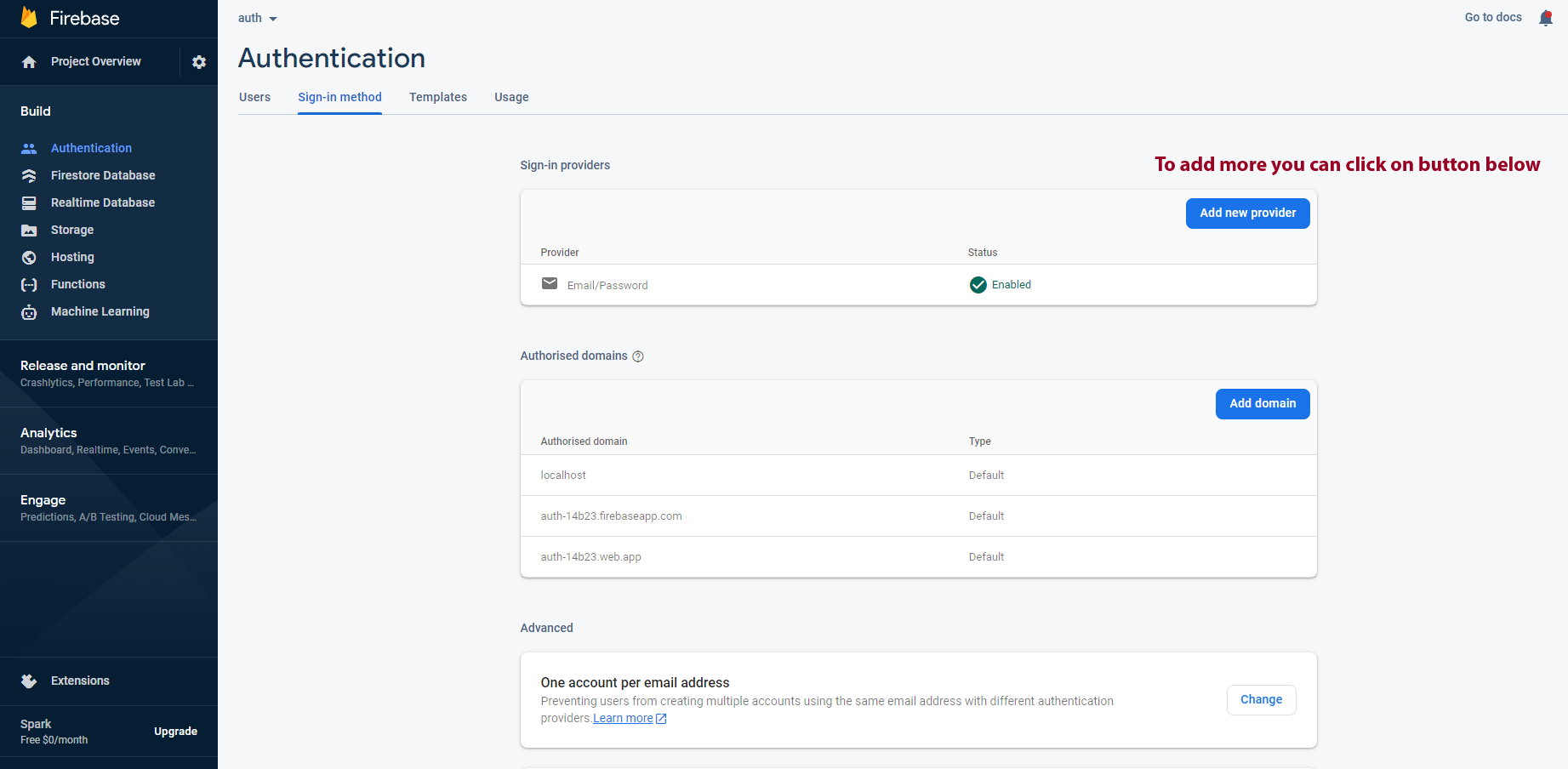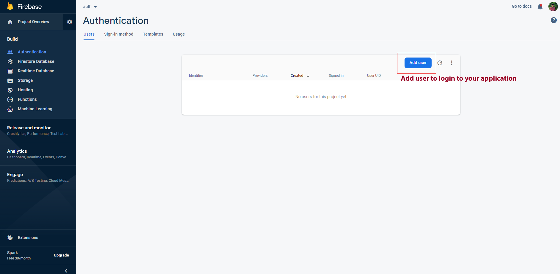 step-2: Add firebase API configuration details(create database on firebase) to the firebase Auth Component refer the path (synto/shared/firebase/firebase.tsx component)